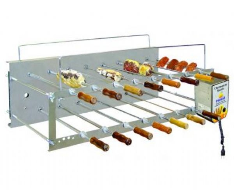 ProgasCARACTERÍSTICAS TÉCNICAS Estrutura em aço inox; Engrenagens em alumínio fundido; Espetos em aço inox; Opções com 1 ou 2 galerias; Galeria para descanso dos espetos; Cantoneira removível; Capacidade para 6, 9 ou 15 espetos de 755mm; Espaçamento entre espetos de 122,5mm; Motor de 24v, transformador bivolt ou 110/220volts; Painel de comando (esquerdo ou direito); Controlador de velocidade opcional nos modelos de Churrasqueiras Plus.