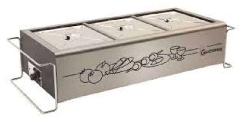 GastromaqCaracteristicas Balcão Térmico fabricado com tanque estancado para Banho Maria em Aço Inox 430 e externamente com aço Inox 430 Escovado com dreno dágua. Disponíveis com 2 e 3 cubas em aço inox, com tampas em inox (modelo standart) ou de vidro basculante (modelo super luxo), aquecido com resistência tubular em aço Inox 304 e controlado pelo termostato 20°C à 120°C. Lâmpada Piloto para controle do aquecimento. Suspenso por aramados cromados. Disponíveis com ligação 110v ou 220v. Indicado para restaurantes em geral. Especificações Técnicas MODELO - BTME 03 ST NUMERO DE CUBAS - 3 POTENCIA INSTALADA - 1.3 Kw TENSÃO - 110 OU 220 V DIMENSÃOES (AxLxC) - 245 x 1015 x 420 mm Imprimi