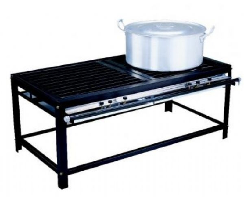 ProgasCARACTERÍSTICAS TÉCNICAS Estrutura em aço com acabamento em pintura epóxi na cor preta, desmontável; Perfil 5cm reforçado; Grelhas paralelas super reforçadas 710 x 640mm; Queimadores triplos diam. 420mm com fixação através de encaixe; Comandos individuais para cada queimador, registro de alta pressão, estágio contínuo; Nesta linha o cliente escolhe o fogão conforme as suas necessidades, conjugando bocas duplas e triplas.