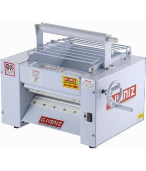 GpanizPara sovar e laminar massas para pães, pizza, pastel, lasanha, caneloni, tortéi, ravióli, rondéli, e similares - Rolos em aço SAE 1020, revestidos em cromo duro, montados em mancais de ferro fundido -Rolamentos com blindagem especiais Redução de velocidade através de polias e engrenages cokm correntes ASA 35 - Regulagem prática de espessura: por manipulo na parte superior - Maio segurança e durabilidade: motor totalmente fechado com arramado sobre os rolos, para evitar o contato com o operador - Acabamento em pintura epóxi, com opcional da bandeja em aço inox ou epóxi