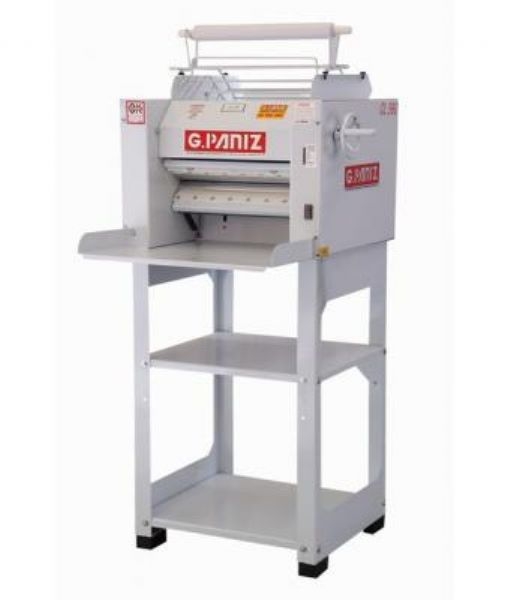 GpanizPara sovar e laminar massas para pães, pizza, pastel, lasanha, caneloni, tortéi, ravióli, rondéli, e similares - Rolos em aço SAE 1020, revestidos em cromo duro, montados em mancais de ferro fundido -Rolamentos com blindagem especiais Redução de velocidade através de polias e engrenages cokm correntes ASA 35 - Regulagem prática de espessura: por manipulo lateral - Maio segurança e durabilidade: motor totalmente fechado com arramado sobre os rolos, para evitar o contato com o operador - Acabamento em pintura epóxi, com opcional da bandeja em aço inox ou epóxi. - Pedestal opciona