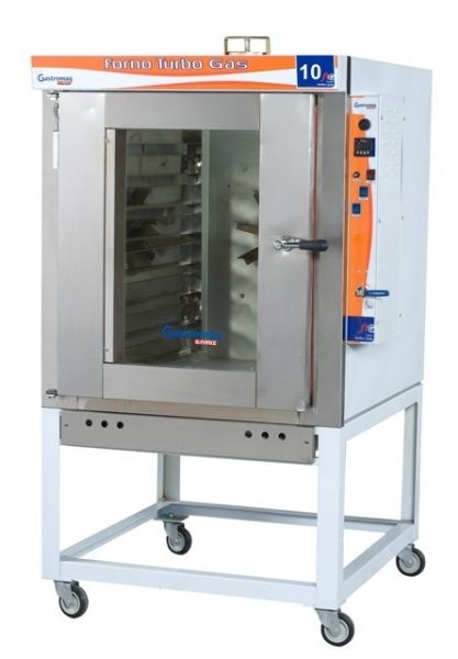 GastromaqCaracteristicas Fabricado em aço SAE 1020 revestido internamente com pintura alumínio (atóxica) e externamente com pintura epóxi branca. Possui a frente, porta e os suportes das bandejas fabricado em aço inox AISI 430. Sistema Turbo que através de uma hélice, circula o ar quente fazendo com que o pão asse uniforme. Baixo consumo de gás. Painel de fácil operação, com botões de acionamento para geral, motor e lâmpada. Controlador digital que emite uma alarme sonoro para avisar o término do tempo desejado e controla a temperatura desejada. Controla o tempo de vapor desejado. Luz para melhor visualização da câmara interna. Compatível com bandejas de 58 x 70cm e 40 x 60cm. Isolamento térmico em lã de rocha. Rodízios para facilitar a locomoção