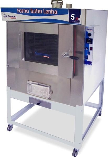 GastromaqCaracteristicas Fabricado em aço SAE 1020 revestido internamente com pintura alumínio (atóxica) e externamente com pintura epóxi branca. Possui a frente, porta e os suportes das bandejas fabricado em aço inox AISI 430. Sistema Turbo que através de uma hélice, circula o ar quente fazendo com que o pão asse uniforme. Sistema e controle de aquecimento através de uma gaveta de cinzas onde reduz a entrada de oxigênio para a fornalha, reduzindo as chamas. Moldura e fornalha em ferro fundido. Baixo consumo de lenha. Painel de fácil operação, com botões de acionamento para geral, motor e lâmpada. Controlador digital que emite uma alarme sonoro para avisar o término do tempo desejado ou a temperatura desejada. Controla o tempo de vapor desejado. Luz para melhor visualização da câmara interna. Compatível com bandejas de 58 x 70cm e 40 x 60cm. Isolamento térmico em lã de rocha. Rodízios para facilitar a locomoção